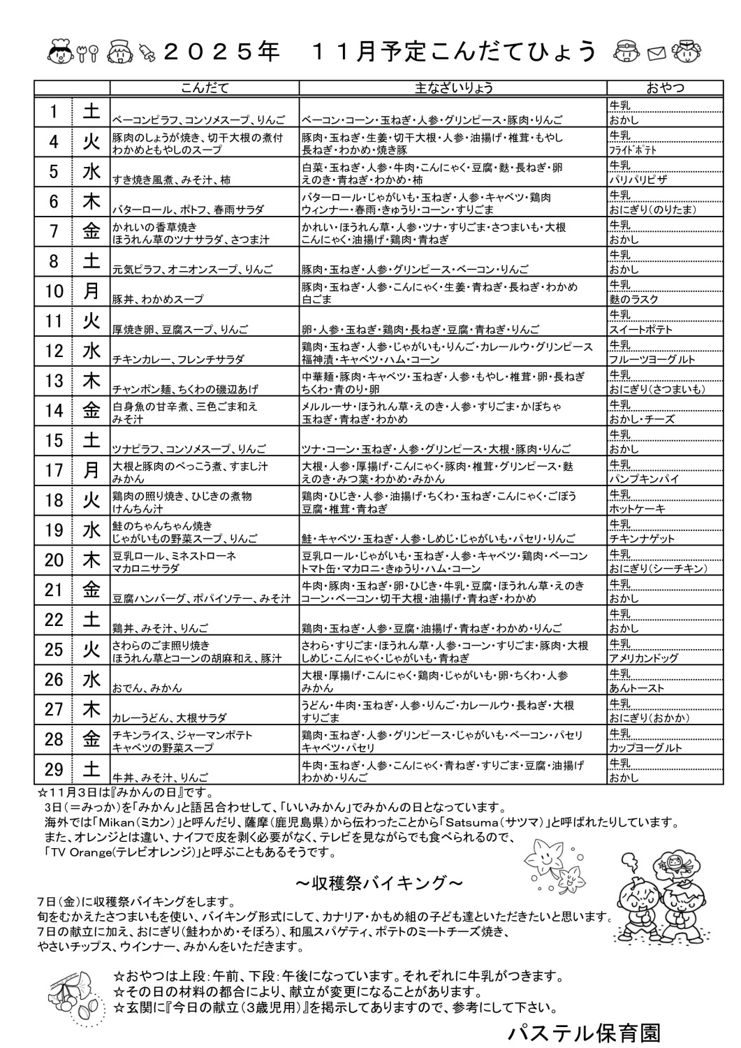 11月予定 こんだてひょう