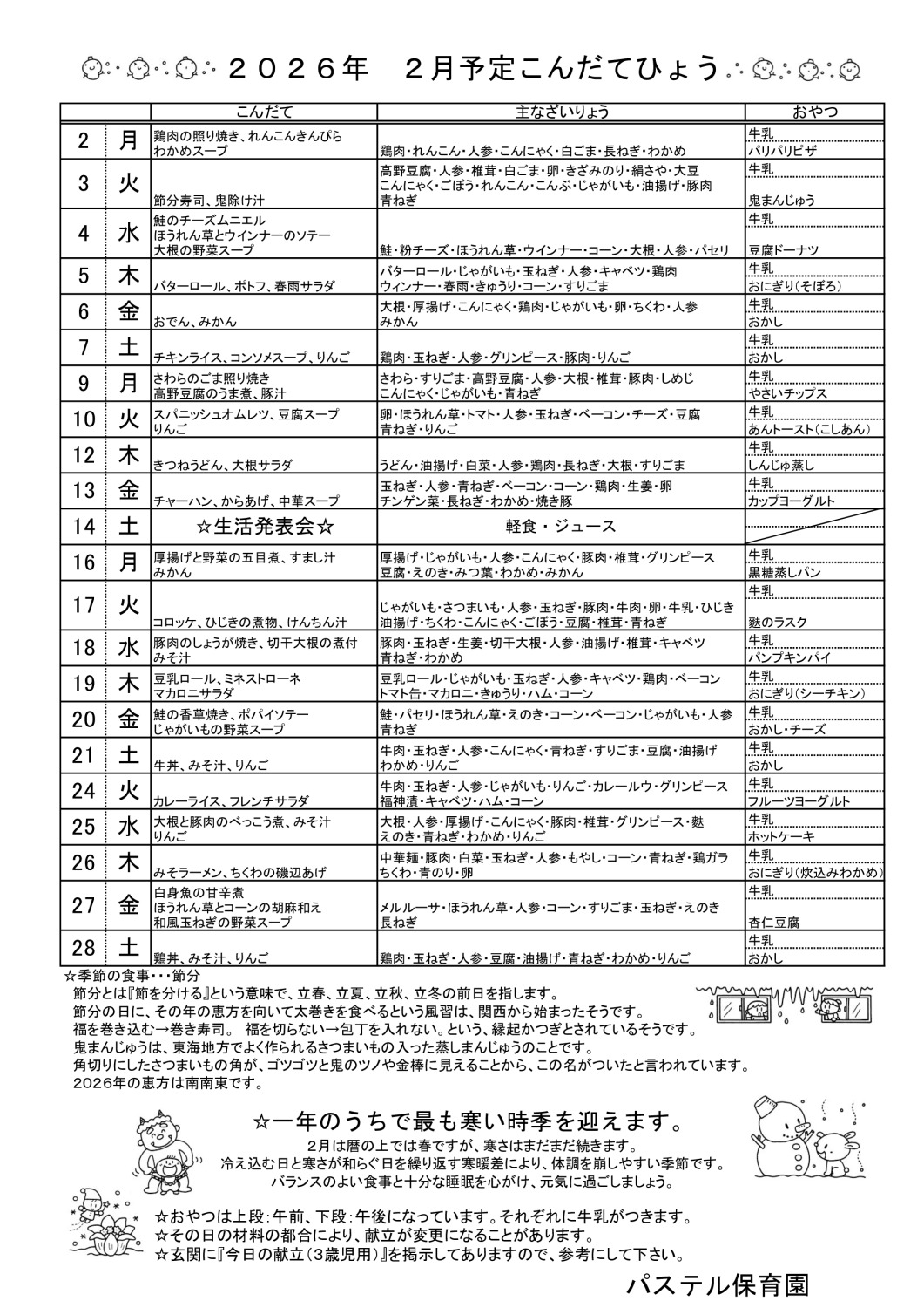 2月予定 こんだてひょう