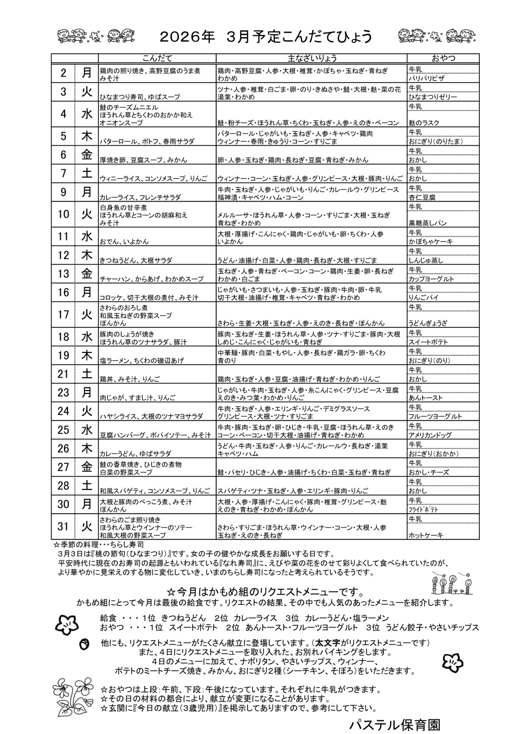 3月予定 こんだてひょう