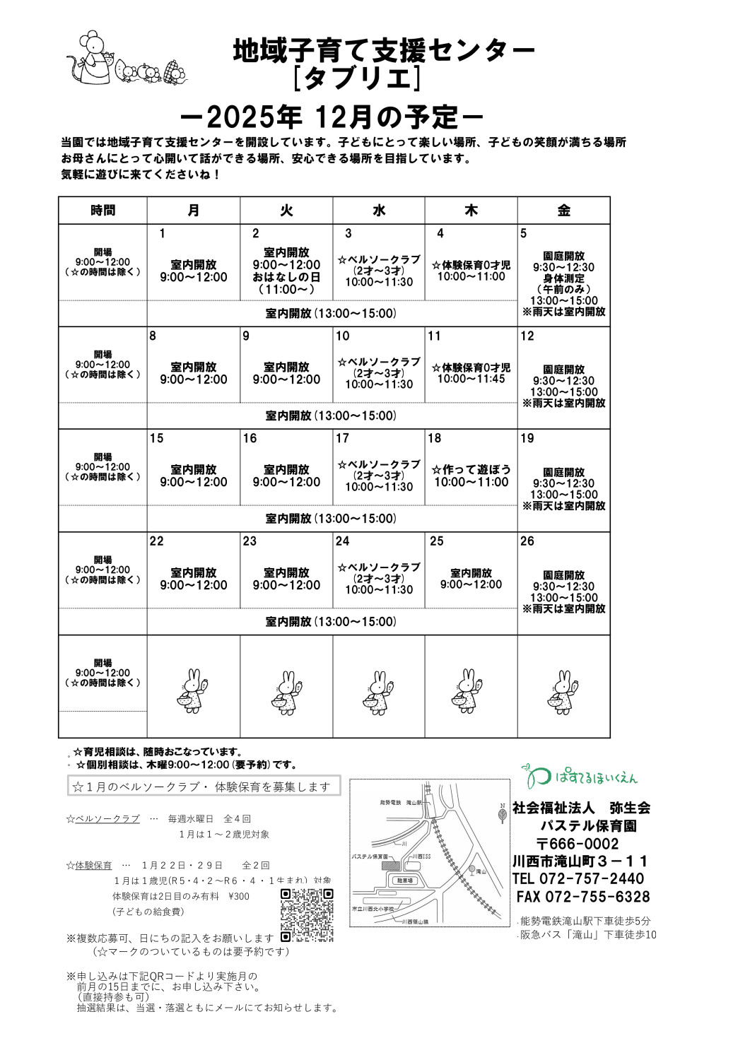 | 園庭開放 | 園庭の遊具やおもちゃで、親子であそべます。 | 在宅の乳幼児とその保護者 | 毎週金曜 9:30~12:30 /13:00~15:00 ※第1金曜のみ 09:30~11:00 (身体測定) |